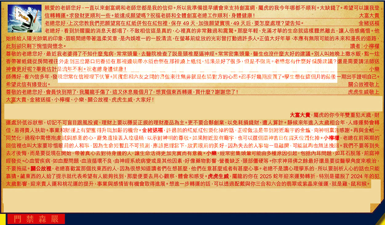 【1】.親愛的老師您好,一直以來創富網和老師您都是我的信仰。所以我準備提早續會來支持創富網,屬虎的我今年哪都不順利。太缺錢了。希望可以讓我登。 信轉轉運。求發財更順利一些。能達成願望嗎?祝福老師和全體創富老總工作順利,身體健康! ---大富大貴