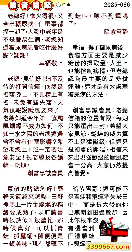 2.出老總,見信好!迫不及待的打開信箱,依然是名落孫山,不見榜上有名,未免有些失落。天氣預報說颱風要來了,老總知道今年第一號颱風蝴蝶不威力如何,不知一水之隔的老總這邊會不會有什麼影響?希望老總上下班一定要注意安全!祝老總及各編輯一帆順。====創富忠誠會員