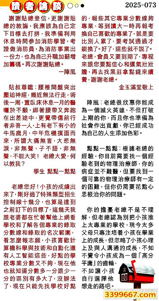 3.老總 您好!小孩的成績出來了,剛好過了特殊類型招生控制線十幾分,也算是達到之前訂下的目標了,這幾天我跟老婆都在忙著幫他上網看學校和了解各個專業的錄取分數線和錄取的名次範圍,看怎麼報志願,小孩喜歡計算機科學與技術和自動化還有人工智能這些,好點的學校專業分數又不夠,現在他也就知道分數多一分跟少一分的區別有多大了,沒辦法了,現在只能先找學校好點的,報些其它專業分數線夠專業,等到讀大一時再報考換自己喜歡的專業了,就是要比別人累了,要考試通過才能換了。好了,這些就不說了。老總,會員又要到期了,專程來跟您要點信心和運氣壯壯膽,再去找黑莊拿點錢來續费,謝謝老總。====金玉滿堂敬上