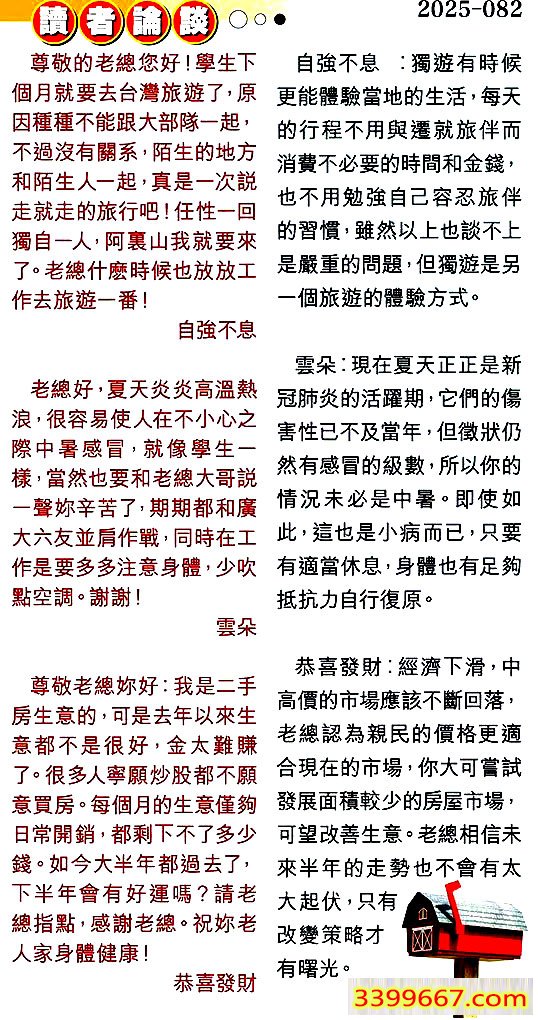 2.老總好,夏天炎炎高溫熱浪,很容易使人在不小心之際中暑感冒,就像學生一看樣,當然也要和老總大哥說一聲称辛苦了,期期都和廣大六友並肩作戰,同時在工作是要多多注意身體,少吹點空調。謝謝!====雲朵