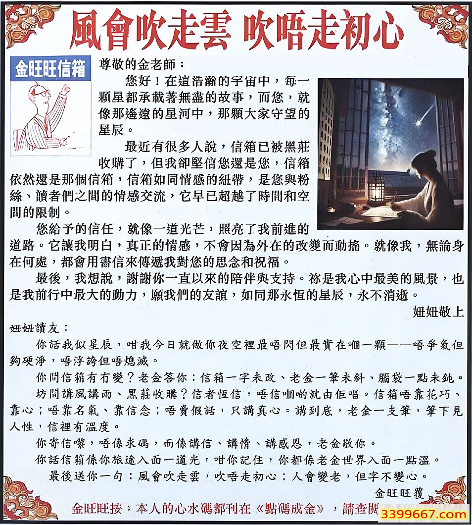115期:金旺旺信箱彩民推荐→→《風會吹走雲 吹唔走初心》